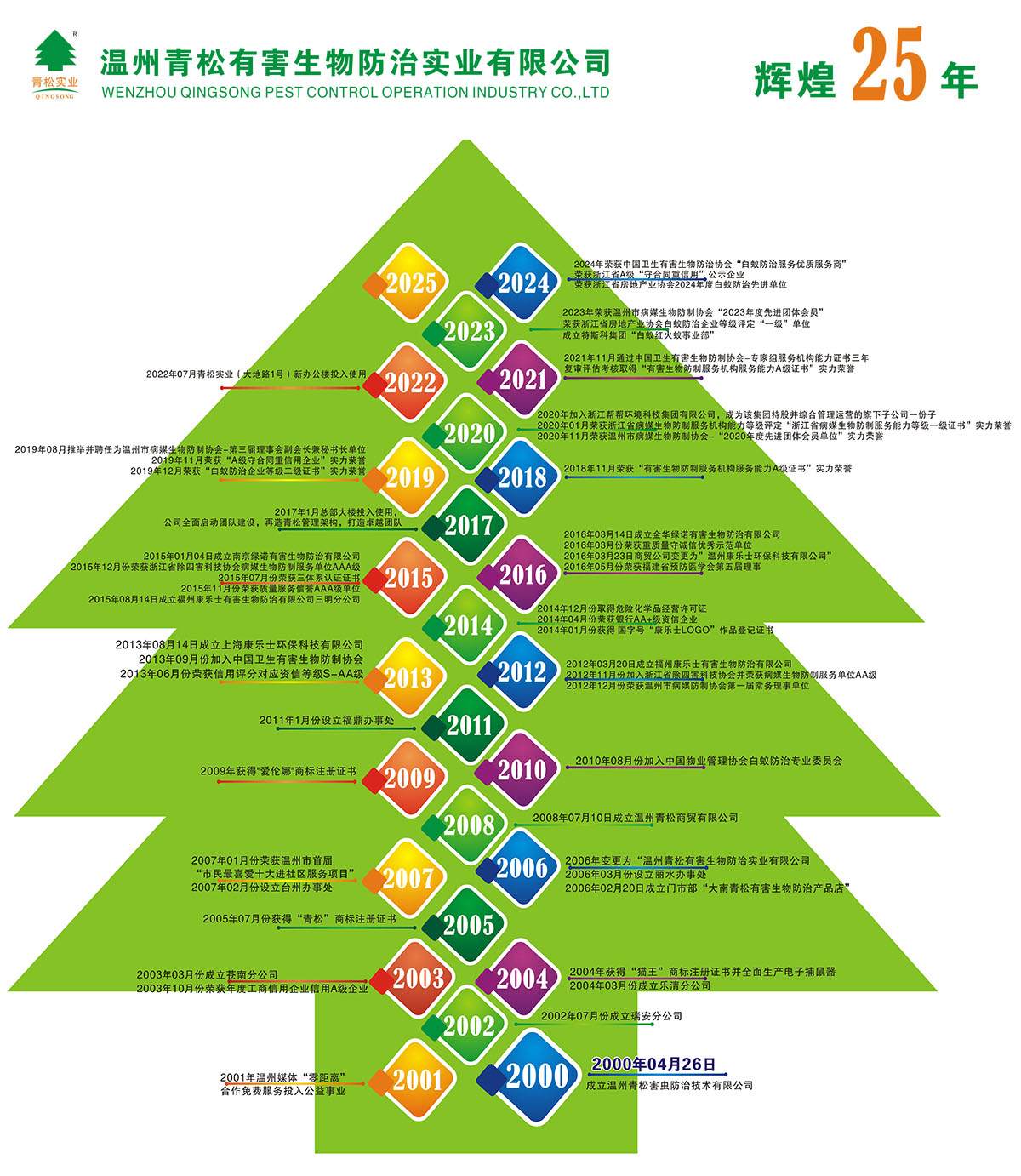 公司成立20年,立足于溫州地區(qū)及周邊城市,現(xiàn)公司在瑞安、蒼南、樂清、麗水、臺州、福鼎、福州、上海、南京、福州三明、金華等11處設(shè)分公司和辦事處,對各地區(qū)蟲害防制、城市創(chuàng)建服務(wù)做出長遠的貢獻。